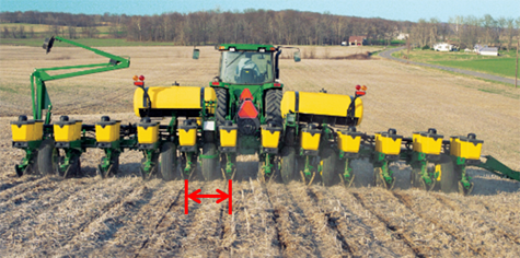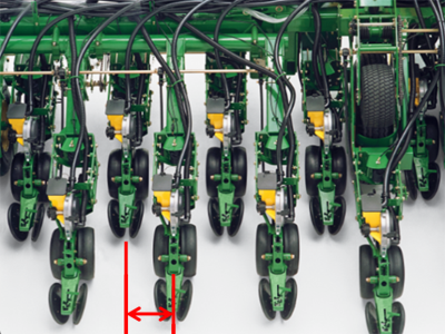 This measurement is distance between rows or nozzles. For example, on planters, measure from center of one engaged row to center of next engaged row.